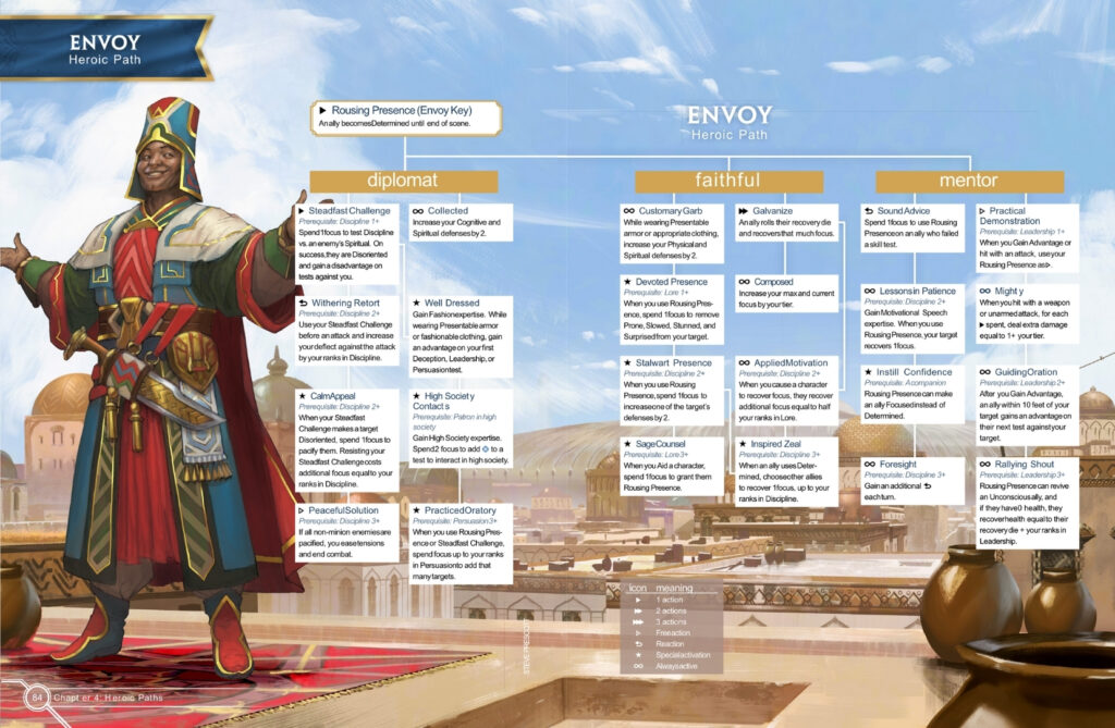O Diplomata se especializa em resolver conflitos através de palavras cuidadosamente escolhidas. Uma das possibilidades que você pode encontrar aqui é a de encerrar combates simplesmente porque argumentaram de forma convincente. Além disso, na alta sociedade, eles navegam com elegância natural, convencendo pessoas poderosas e moldando eventos políticos.